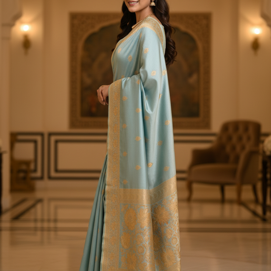Weave: Intricate Allover Gold Zari Weaving (often using the Kadwa or Katan technique).